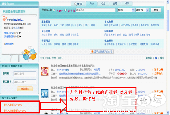 输入完毕后,我们可以看到条件”购物“、”淘宝买家“是互补的,点击”查找“进入详细页面,这里有很多买家发布的信息,但要注意的是,并不是所有群都去加入,因为有些是不适合我们的,这就要看合适自己的!要选对目标群,比如”买家交流群“、”淘宝促销团“等等。还要注意人气高的群,因为人气高,自然那里是最能产生流量以及资源的! 内容来自