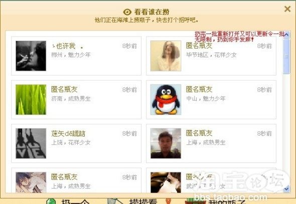 六、接着就是我们所说的无限制发送漂流瓶了。大家知道每个qq号每天可以扔6个捡6个,这个数量是不够的。现在就告诉大家一个秘密拉!在侧边栏如图查看附近的人, 内容来自