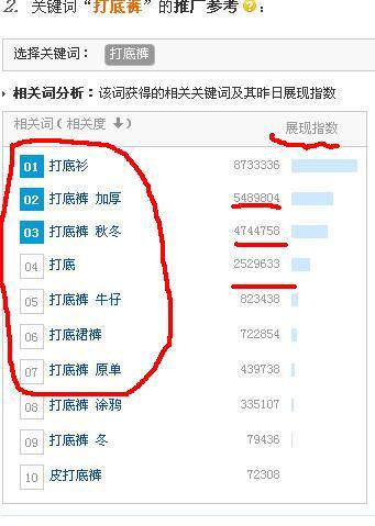 我们还是以“打底裤”为例子,输入框里输入“打底裤”,这个工具就会分析出这个词的一些搜索数据,我们可以看到有展示指数,相关词分析等等,我们要利用的就是相关词分析这个版块了。如下图: 内容来自