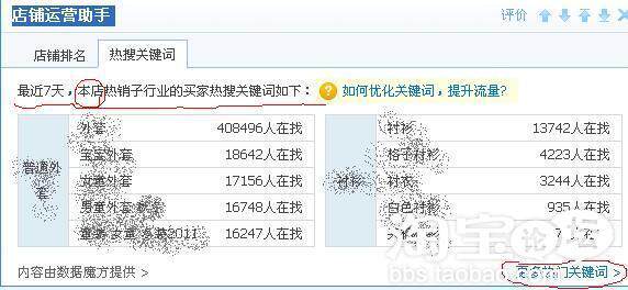 我店铺里搜索比较高的两件商品就是和外套、衬衫有关系了。他这里就给出了这两个词的其他相关关键词,也就是长尾关键词,你要利用好这些词语,你看他们的搜索量都不小的。更多的热门关键词也可以点右下角的链接进去查看。 内容来自