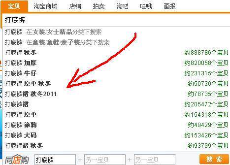 这个地方相信大家都不会很陌生吧,只要你上淘宝的,肯定都会用到这个搜索栏的,即使你是卖家,但是你也有买东西的时候吧。我们买东西最直接的方法就是在上面输入你要搜索的商品的关键字,然后再去选择你喜欢的宝贝,所以这里产生的关键字都是非常有价值的,最能体现出普通买家的最直接的目的,也是大家最喜欢用的一些关键词的组合,包括长尾关键词在这里都能找到。既然这样,我们为什么不好好利用这里的资源呢。例如我么以“打底裤”这个词为例子,在搜索栏里输入“打底裤”这个词后,搜索栏会自动弹出一个下拉框,下面显示出了很多的关键字,都是和这个“打底裤”相关的一些关键字,还有这个关键词下面所有的宝贝数量。如下图: 本文来自菁菁网