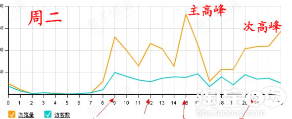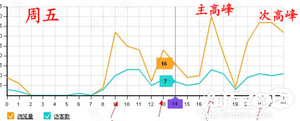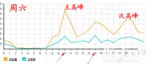 从图中展现的情况来看,工作日的主高峰时段主要集中在中午12点-13点半的区间,而休息日则有所不同,可能变成晚上20点-21点的区间。每个店的产品不同,针对的客户群体不同,购物的习惯时间可能也会有所差异,大家可以按照这个方法,找出自己店铺每天的主高峰和次高峰时段,然后将宝贝的上架时间,集中设定到主高峰和次高峰时间之后1-2小时的时间点上。