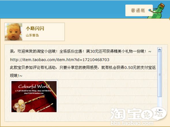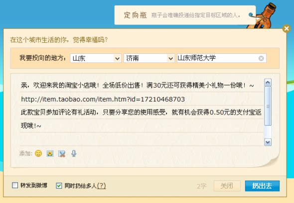 再来说下定向瓶,定向瓶就是在普通瓶的基础上加上了一个设定投信地的功能哦,就像我们寄信要写地址一样,比如你卖的东东是适合学生的,那么你可以写上一个学校的地址,这样的话效果会事半功倍哦!~ 菁菁好,好菁菁网
