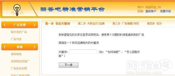 在这里要说明的是,“回答吧”是一个月免费试用的哦,但是只可以发布一个关键词或推广一个店铺,怕花了钱又没效果的卖家们可以先免费试用的。
