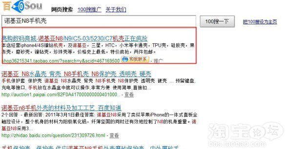 下面我说下,“100搜”和“回答吧”具体是怎么推广的,假如我设置了关键词“诺基亚N8手机壳”,但买家在进入“回答吧”或“100搜”首页,在搜索框中输入我所设置的关键词,买家就能看到如下效果: