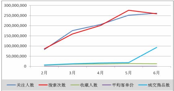 从上面的走势图中,可以清晰的看到2、3、4、5月份的商品销售数量并没有随着关注人数或搜索人数的增加而有较大的增幅。进入6月以后,因天气等因素,商品成交数量呈近5倍的速度的增长,也直接反应出网购人群对于商品在季节变化的需求。商家需要根据自身情况,做出相应的运营策略。销售策略、推广策略正确无误的商家,应做好订单量激增的准备。