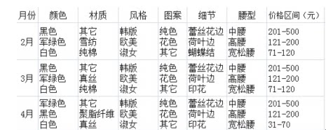 产品方面,对比去年和今年,夏装连衣裙市场热销特征上,黑色和军绿色依然是主色调,材质上纯棉和雪纺依然是主流面料。风格、图案、腰型上没有太明显的变化。相比去年,今年的市场热销特征变化还是比较明显的:真丝元素,在去年连衣裙市场占据细节前三的是在六月份,今夏三月份,印花元素即冲进前三,呈黑马状态。要说黑马,最大的黑马莫过于材质中的真丝元素,去年一整个夏季,一次都没有冲击进材质前三。而今年,三月份开始即和印花元素一起成为了今夏连衣裙的主流元素。总体看来今年连衣裙热销特征中,颜色方面,在今年4月份军绿色超过了黑色占据第一;材质方面,真丝得到了广泛的应用;细节方面,印花元素挤掉蝴蝶结元素位居前三;价格区间上,较去年有了较大的提高。