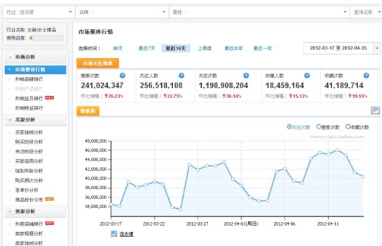 据数据魔方的数据显示,2011年2月,夏装连衣裙市场:关注人数82,423,470,搜索次数86,300,011,收藏人数5,470,375,平均客单为187元,成交商品数6,733,876。并且随着天气的转暖,关注人数,搜索人数,收藏人数等相应指数都在增长。