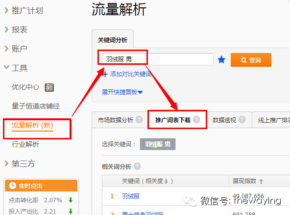 你可以进入流量解析,搜索羽绒服男筛选其他的关键词,并下载推广词表: