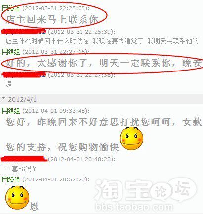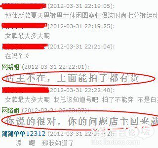 看到没,帮我说了4句话呢 ,让我兴奋的半天 他跟我说这人明天肯定还来找你,我问他怎么这么肯定会来,人家鼠标一点,又进别家了,他说说话一定要有技巧的,大家仔细看看那4句话有什么技巧吗 反正我是没看出来 不过第二天那人还真的来了,只是碰上我接待又黄了买家要买两套,一套衣服88他还嫌贵了本来店里的衣服就是为了赚点信誉,价格已经订到最低了,我总不能为了赚信誉还钱贴出去吧,贴钱赚信誉这种事目前还没想过 那时就想着要是老公在旁边再帮我周旋几句,或许就成了。唉,这辈子最不擅长的就是忽悠人了,2个信誉呢!