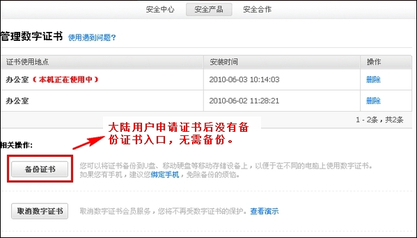 非大陆用户申请证书后有备份证书入口。