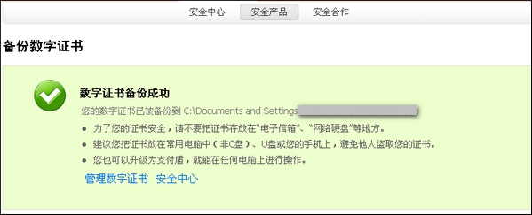 3、点击【备份】后,会生成一个“XXXXXX.pfx”的备份文件,该XXXXXX会自动显示为支付宝账户的名字,要好好保管好备份的资料,并且请记住证书的备份目录;